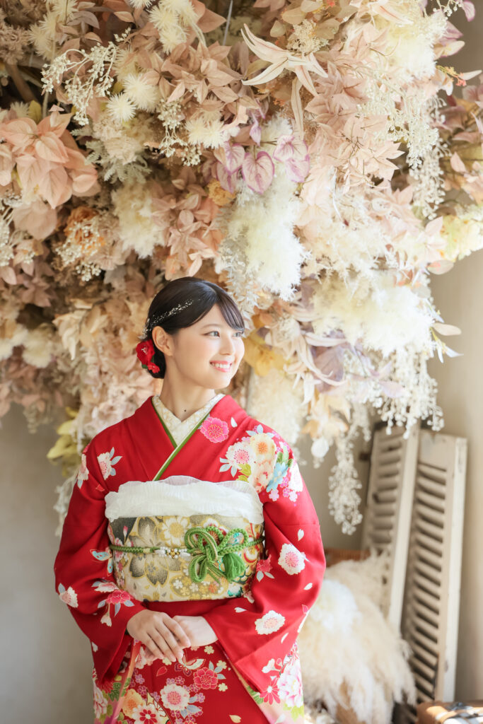 土日祝日に撮影の場合は追加料金¥5,000がかかります <プランに含まれるもの> 撮影料(主役ソロ撮影・家族撮影) 着付け・ヘアセット・メイク 写真1枚(六つ切り台紙1面仕上げ) 撮影時の着付小物レンタル カラードレス撮影(ご希望の場合) ※振袖一式レンタルも含まれた「手ぶら撮影プラン」は¥29,800でご案内になります